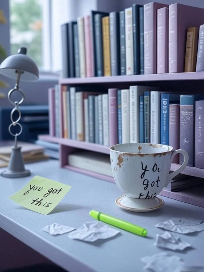 Chipped teacup, sticky note "you got this," mismatched earring on lamp, lime green pen.