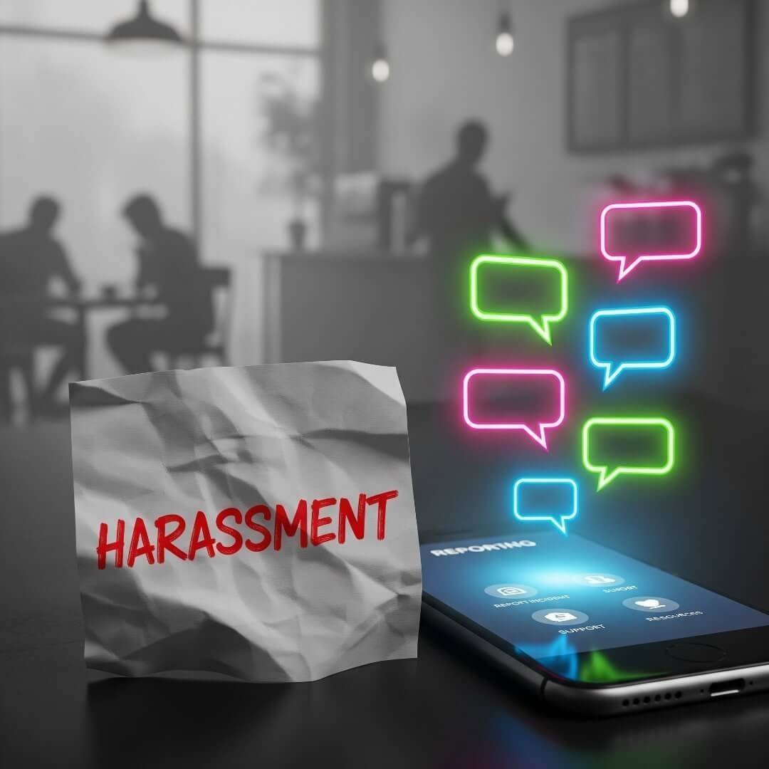 Scrunched sticky note "harassment," phone with reporting app, blurred coffee shop, neon bubbles.